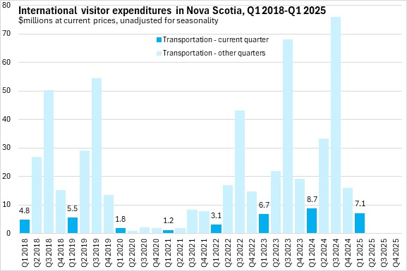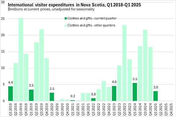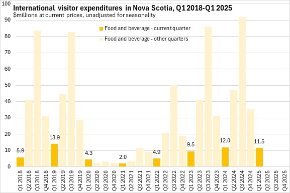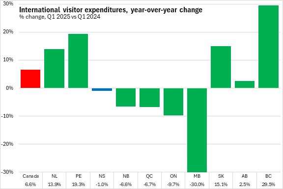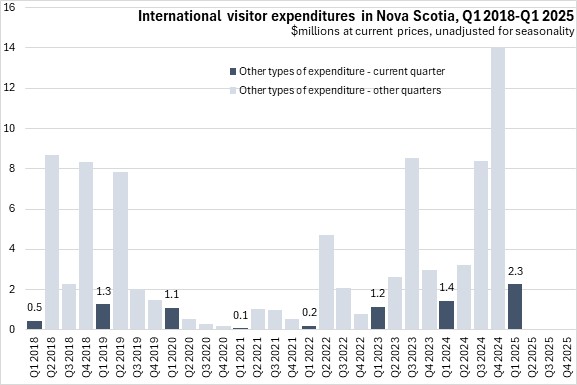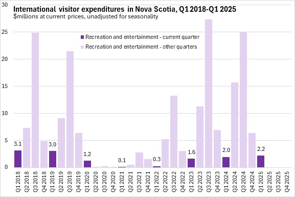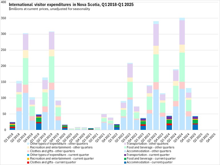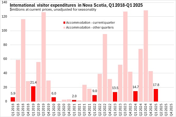 In unadjusted results by quarter, Nova Scotia's accommodations expenditures by international visitors were in line with previous levels for Q1.