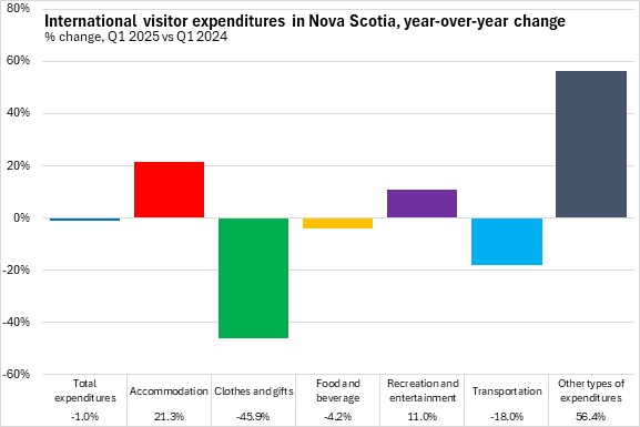 Other types of expenditures, accommodation and recreation/entertainment reported the only gains while the other three categories reported declines lead by clothes and gifts in Q1 2025 compared to Q1 2024.