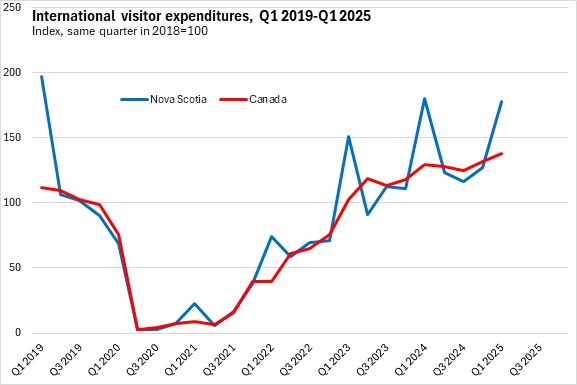 International travel expenditures have largely recovered to pre-pandemic levels in the last year, though some of this recovery includes the effects of rising prices. After a peak in the first quarter of 2024, international expenditures started to decline in Nova Scotia, before again rising in Q1 2025. Canada's international expenditures continued trending up, but were below international expenditures in Nova Scotia in Q1 2025.