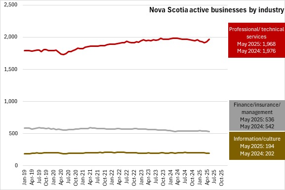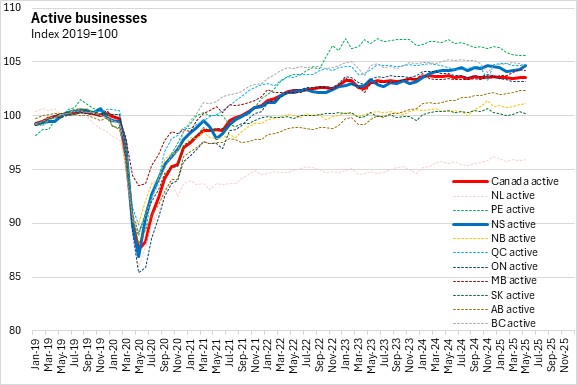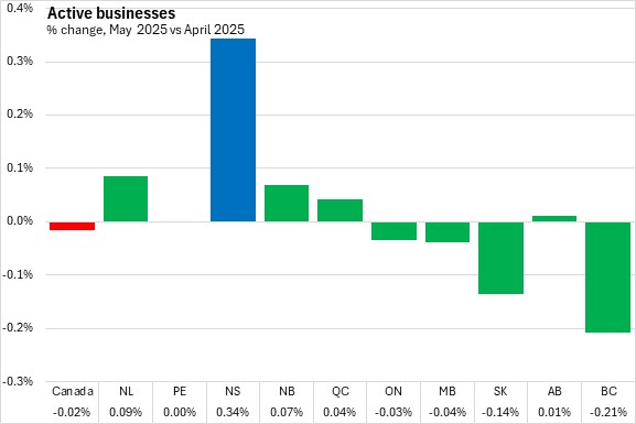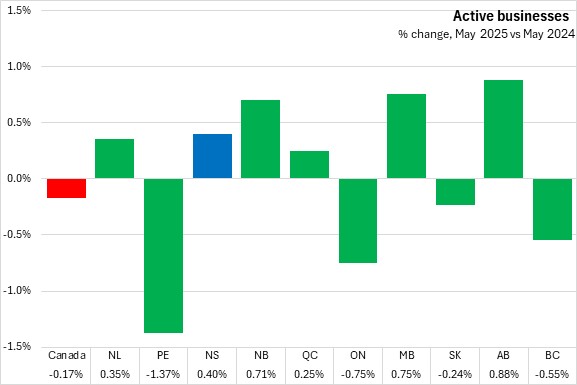 Compared with May 2024, the number of active businesses was up 0.40% for Nova Scotia. Nationally, active businesses were down 0.17% compared to May 2024. Alberta reported the largest increase in active businesses and Prince Edward Island reported the largest year-over-year percentage decline in active businesses.