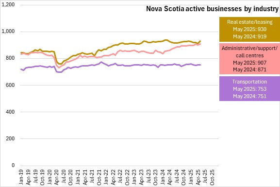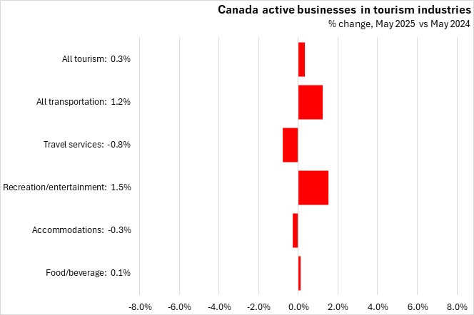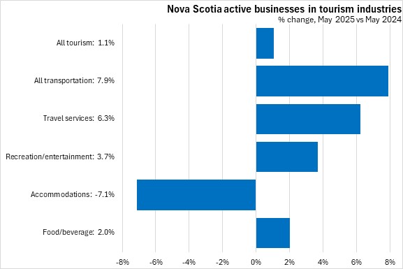 Statistics Canada has broken out specific data for tourism-related industries. Compared with May 2024, the number of active tourism-related businesses rose 1.1% in Nova Scotia as of May 2025, with gains in all subsectors except accommodations.