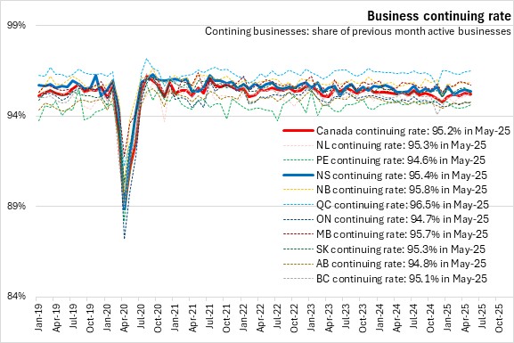 Most businesses continue operating each month. In May 2025, Nova Scotia's business continuing rate was 95.4%, slightly above the national average (95.2%). Québec reported the highest business continuing rates (96.5%) while Prince Edward Island reported the lowest continuing rate (94.6%).