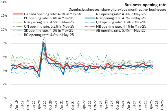 Nova Scotia's business opening rate was 4.7% in May 2025, below the national average of 4.8%. Prince Edward Island and Alberta had the highest business opening rates (5.4%) while Québec had the lowest (3.6%).