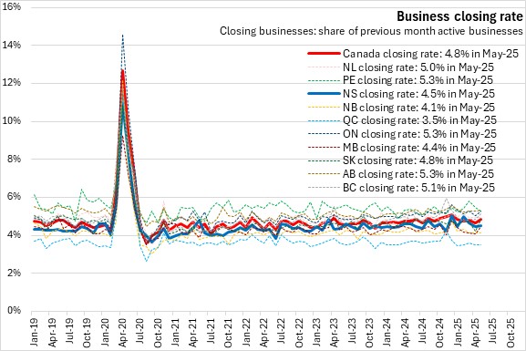 Nova Scotia's business closing rate was 4.5% in May 2025, just below the national average of 4.8%. Alberta, Ontario and Prince Edward Island reported the highest business closing rate (5.3%), while Québec had the lowest business closing rate (3.5%).