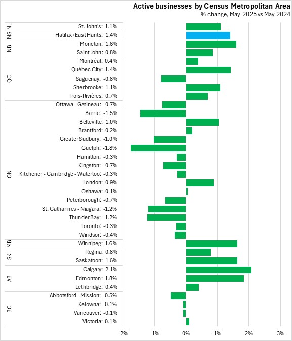The number of active businesses in the Halifax and East Hants Census Metropolitan Area was up 1.4% from May 2024 to May 2025.