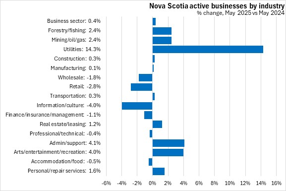 Compared with May 2024, ten sectors saw an increase in active businesses in Nova Scotia in May 2025 with the largest percentage increase in utilities. The steepest decline was in information/culture services.