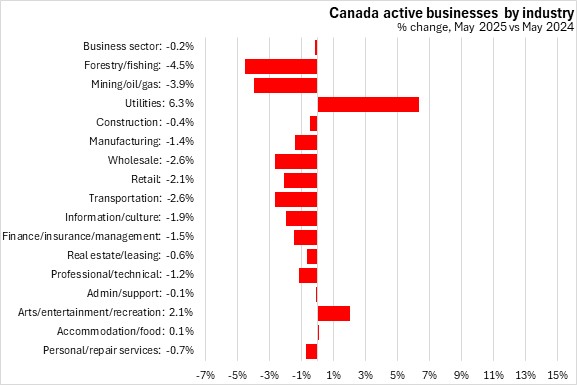 Nationally, the number of active businesses was down for all business sector industries except utilities, arts/entertainment/recreation, and accommodation/food, with the largest declines in forestry/fishing and mining/oil/gas.