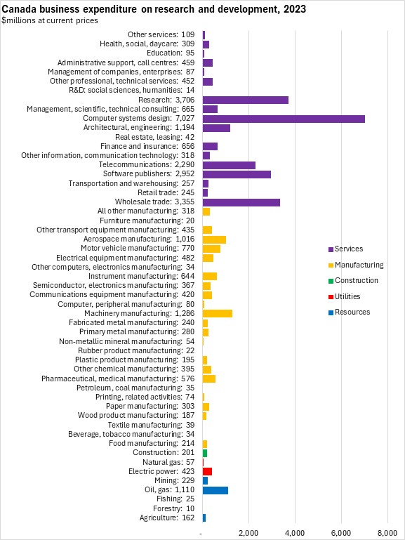 Looking at the research and development spending by industry, majority of spending in Canada was undertaken by businesses in service sectors. The computer systems design and related services sector had the largest R&D spending ($7,027 million) in 2023.