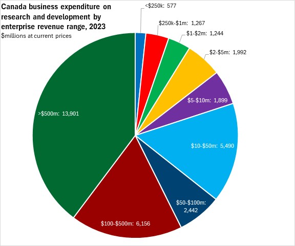 In 2023, Canadian businesses with revenues higher than $500 million had the largest share of total R&D spending accounting for 39.8% of total research and development expenditures. This was followed by businesses with revenues between $100 million and $500 million (17.6%) and revenues between $10 million and $50 million (15.7%) in 2023.