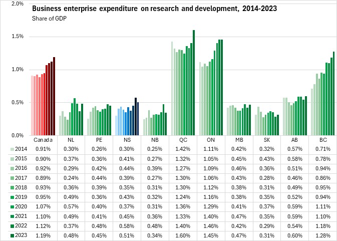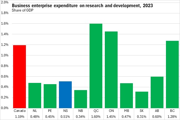 As a share of GDP, business R&D expenditures in Nova Scotia rose in 2021 and 2022, and remains above years prior to 2021, despite declining in 2023. Nationally, the share of business R&D in GDP has increased steadily since 2017.