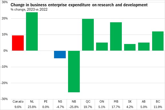 Nova Scotia's research and development spending declined 4.7% from 2022 to 2023 after increasing 36.5% in 2022. Seven provinces reported higher levels of industrial research and development spending in 2023, led by Newfoundland and Labrador. The largest decline was in New Brunswick.