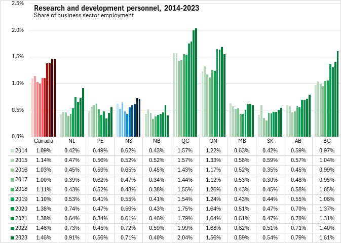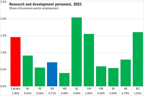 Nova Scotia's share of business sector employment in research and development personnel increased in each of the four years prior to 2023, and edged down in 2023. Nationally, research and development personnel as a share of business sector employment has remained stable for the last two years.