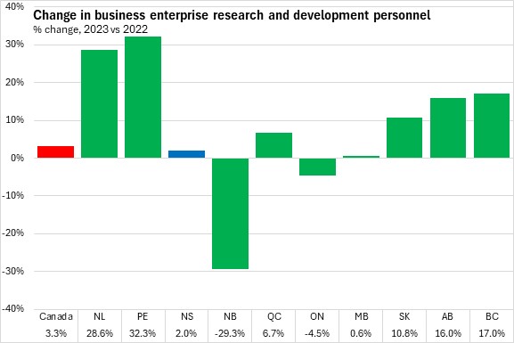 The number of business research and development personnel increased by 2.0% in Nova Scotia in 2023. Nationally, business research and development personnel increased by 3.3% with gains in all provinces except New Brunswick and Ontario. The fastest growth was in Prince Edward Island and Newfoundland and Labrador.