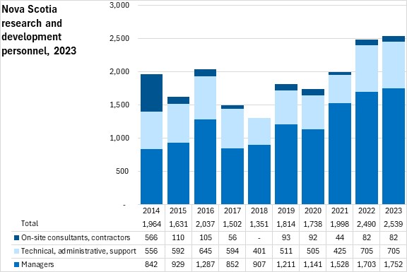 In 2023, there were 2,539 full-time equivalent (FTE) jobs for in-house research and development in Nova Scotia. This was up from 2,490 in the previous year. Researchers and research managers (1,752) was the most dominant occupational category among most Nova Scotia’s business enterprise R&D personnel in 2023. The rest of the R&D personnel was divided among research and development technical, administrative and support staff (705), and consultants and contractors (82), both unchanged from 2022 levels.