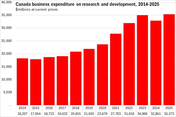 August 27, 2025INDUSTRIAL RESEARCH AND DEVELOPMENT, 2023-2025 Statistics Canada has recently released Industrial Research and Development (R&D) characteristics actuals for 2023 at a provincial level and preliminary/intentions for 2024/2025 at a national level. Results from 2014 and beyond are not directly comparable to earlier data.