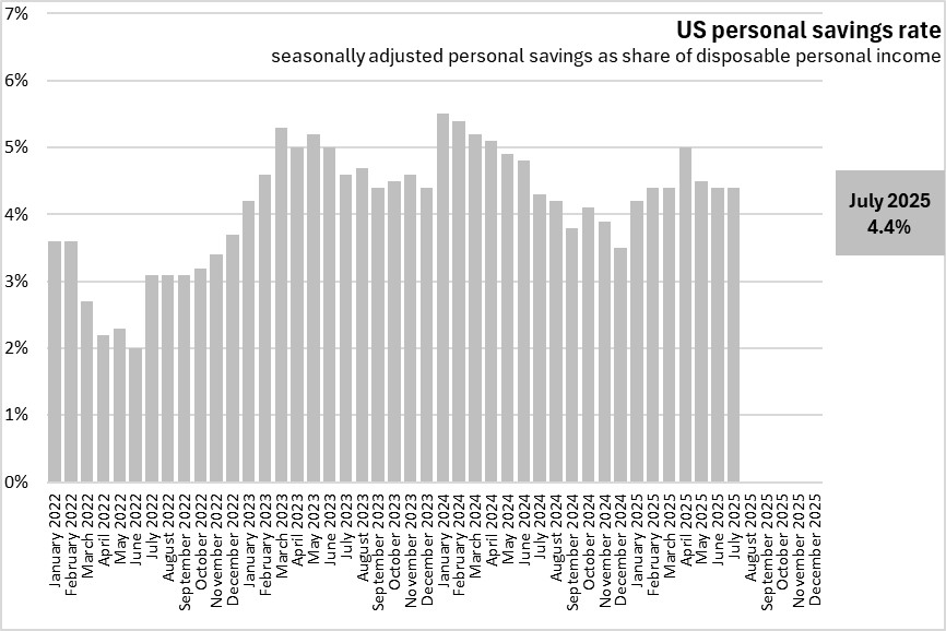 With similar growth rates for personal income and personal consumption the US personal savings rate remained steady at 4.4% of disposable personal income in July 2025.