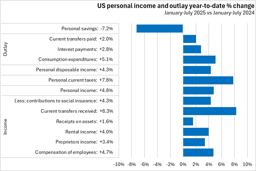 In the first seven months 2025, US personal income increased by 4.8% from the same period in 2024. There were gains from all income sources led by growth in current transfers received (+8.3%). Personal consumption expenditures grew by 5.1%. Personal savings declined 7.2%.