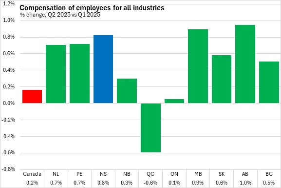 Total compensation of employees for all industries increased by 0.8% in Nova Scotia, rising to $8.82 billion in Q2 2025. National employee compensation was up 0.2% in the second quarter of 2025. All provinces except Québec recorded quarter over quarter gains in employee compensation with the fastest growth in Alberta.