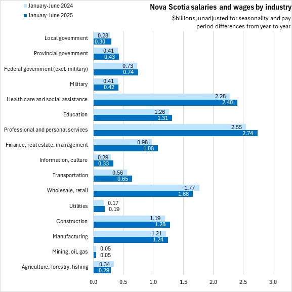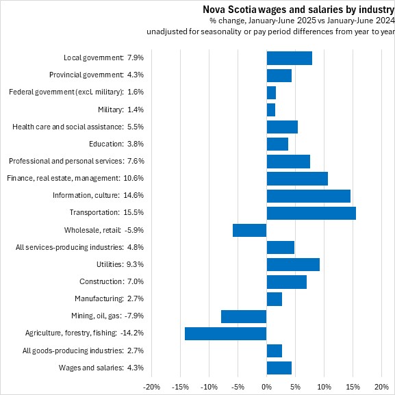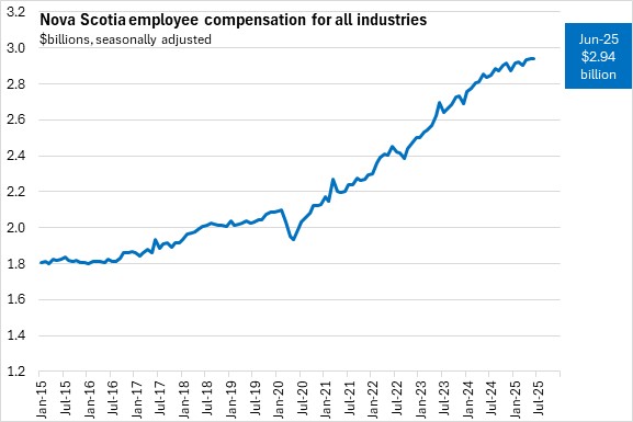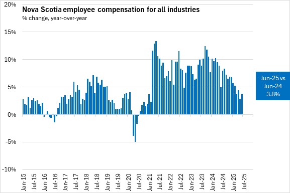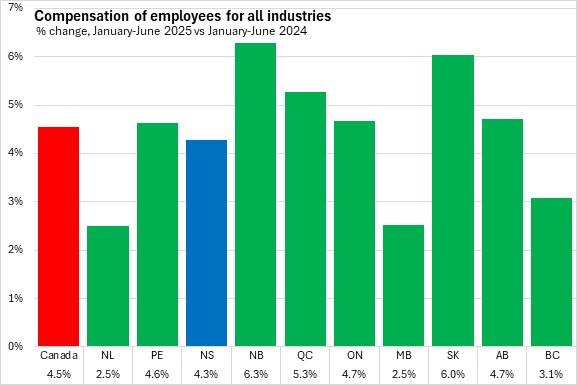 Nova Scotia's employee compensation for all industries was up 4.3% in the first two quarters of 2025 when compared with the same period of 2024. National employee compensation grew 4.5%. All provinces recorded year-to-date gains in employee compensation in the first half of the year, with the fastest gain reported in New Brunswick and the slowest in Newfoundland and Labrador and Manitoba.