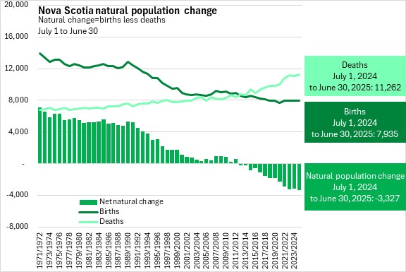 Natural population change (births less deaths) continued to put downward pressure on Nova Scotia's population. From July 1, 2024 to July 1, 2025 there were 7,935 births and 11,262 deaths, resulting in a net natural population change of -3,327 over this period.