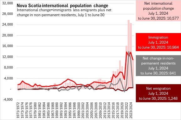 Accounting for the decline resulting from net emigration and the gains from immigrants and non-permanent residents, the net international population change for Nova Scotia was +10,577 from July 1, 2024 to July 1, 2025 - a substantial decline from the previous 3 years.