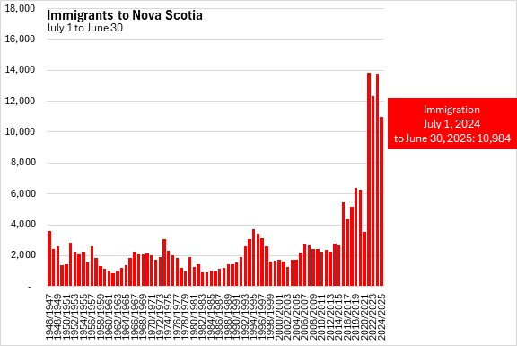 From July 1, 2024 to July 1, 2025, Nova Scotia reported 10,984 immigrants coming to the province. This was down from the record immigration levels reported in recent years, but higher than immigration reported in 2020 and prior years.