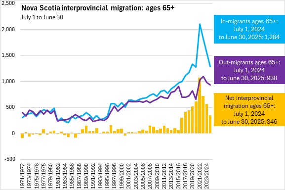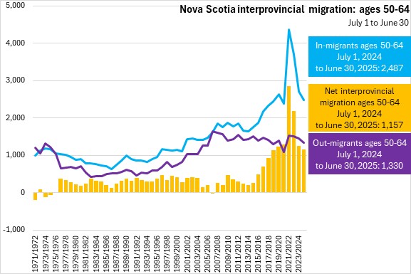 The period from July 1, 2024 to July 1, 2025 marked the tenth consecutive year of positive net interprovincial migration to Nova Scotia. However, the pace of in-migration and net migration slowed sharply since 2022. Net migration was positive for those aged 0-17, 18-34, 35-49, 50-64 as well as for those aged 65 and older.