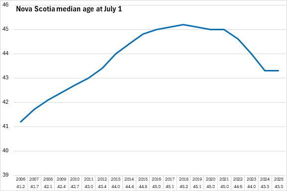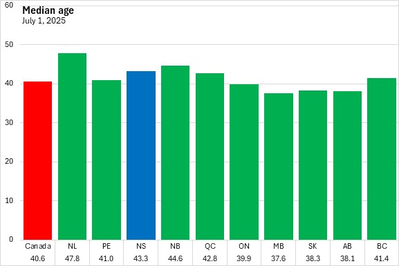 Prior increases in international and interprovincial migration were concentrated among younger cohorts, lowering Nova Scotia's median age substantially. With these population flows slowing, Nova Scotia's median age was unchanged from July 1, 2024 to July 1, 2025 at 43.3 years. Nova Scotia still reported the third highest median age among provinces after Newfoundland and Labrador and New Brunswick. The national median age was 40.6 years with the lowest median age in Manitoba (37.6 years).