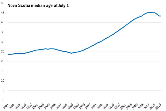Nova Scotia's population last experienced an extended decline in median age during the late 1950s and early 1960s following elevated births from the baby boom.