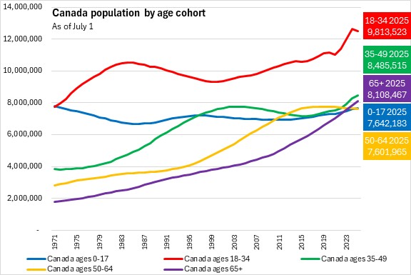 Canada's population aged 18-34 also decreased - for the first time since 2021. The number of seniors in Canada now exceeds the numbers of Canadians aged 0-17 as well as 50-64.