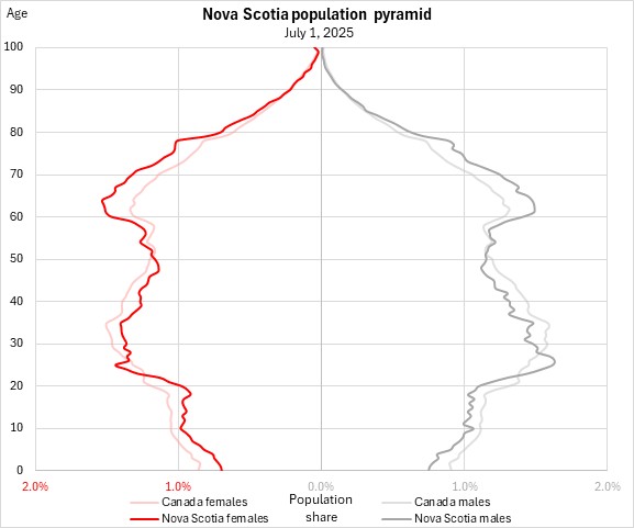Despite a revival of growth among younger population cohorts in Nova Scotia, the population pyramid shows an older population than the national age distribution.