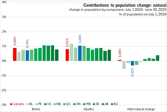 When measured as a percentage of the population on July 1, 2024, Nova Scotia reported less population growth as a result of births and steeper population decline as a result of deaths. Although Canada's national population was still increasing because of natural population change (births less deaths), deaths outnumbered births in all Atlantic provinces and Québec.