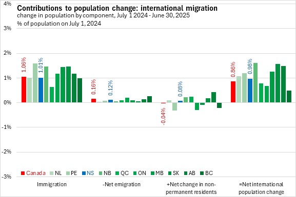The contributions to population growth as a result of net change in non-permanent residents were modest from July 1, 2024 to July 1, 2025. Nova Scotia's population received a small net increase in non-permanent residents. Nationally, net change in non-permanent residents contributed to a small population decline (primarily due to declines in Prince Edward Island, Manitoba, Ontario and British Columbia).