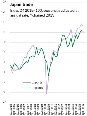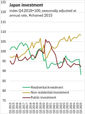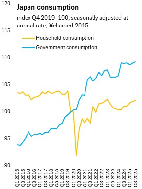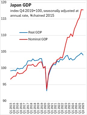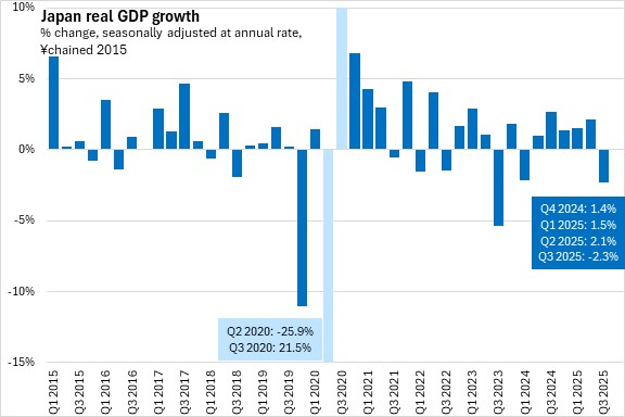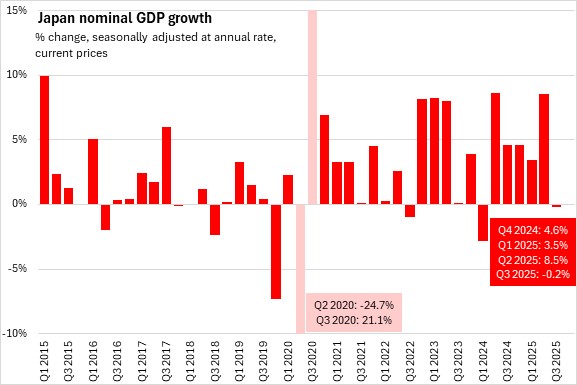 Japan's nominal GDP contracted 0.2% (seasonally adjusted annualized rate) in Q3 2025, revised from 0.5% growth in the first preliminary estimate. The price deflator for Japan's real GDP (the broad measure of price growth) increased at a seasonally adjusted annualized rate of 2.2% in Q3 2025.