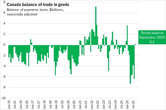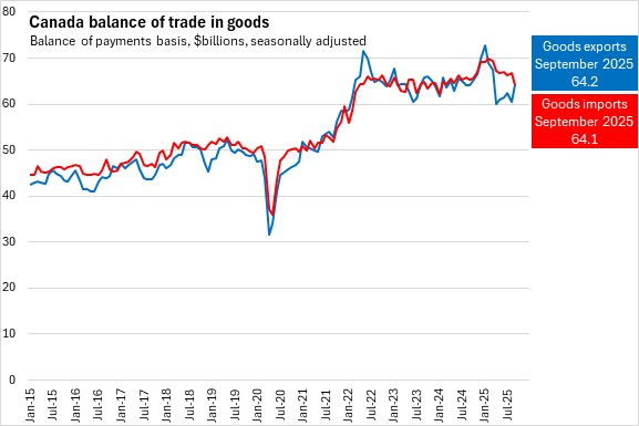 In September 2025, Canada's international exports of goods rose 6.3% to $64.2 billion. Canada’s goods imports declined 4.1% to $64.1 billion. Canada's goods trade balance improved from a $6.4 billion deficit in August to a $153 million surplus in September.