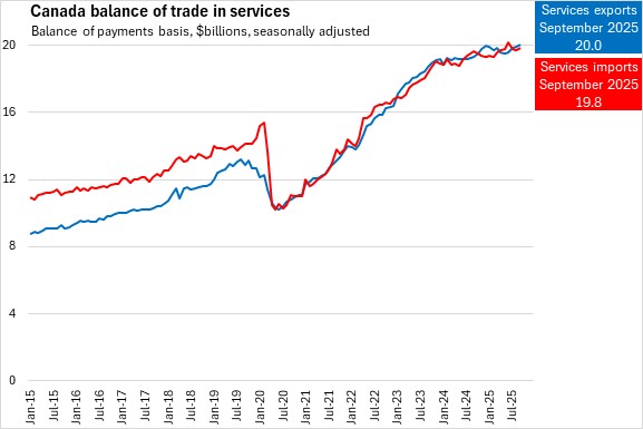 Canada's international exports of services rose 0.7% from the previous month to $20.0 billion in September 2025. Canada's imports of services were up 0.8% to $19.8 billion. Given similar increases in exports and imports of services, Canada's services trade surplus was virtually unchanged at $174.0 million in September.