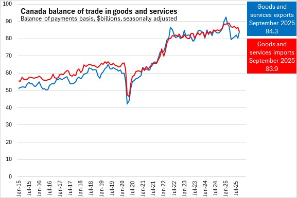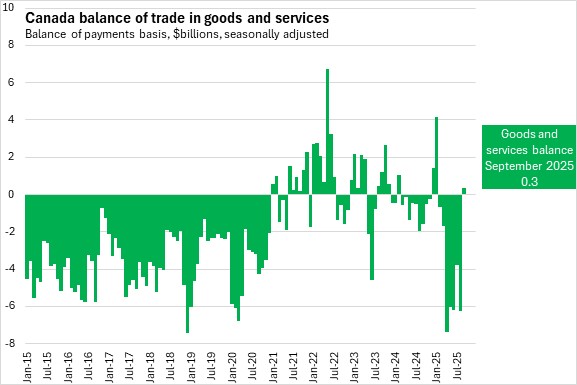 Canada’s international exports of goods and services rose 5.0% to $84.3 billion in September 2025. Canada's international imports of goods and services fell 3.0% to $83.9 billion. Canada's overall international trade position improved from a $6.3 billion deficit in August to a $327 million surplus in September 2025.