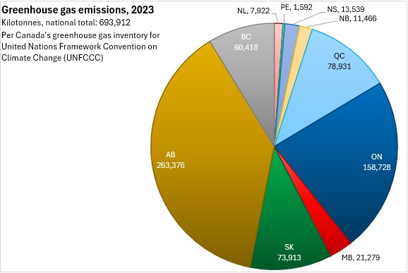 December 11, 2025GREENHOUSE GAS EMISSIONS, 2023 Statistics Canada has published revised figures for emissions of greenhouse gases. The data are presented in two ways: those consistent with Statistics Canada's physical flow accounts and those consistent with the National Inventory Report on Greenhouse Gas Sources and Sinks (which fulfills reporting obligations under the United Nations Framework Convention on Climate Change or UNFCCC). These results are not identical. The analysis below reports emissions per the UNFCCC measures.