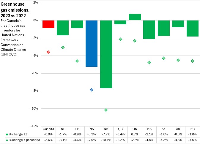 Nova Scotia's population continued to grow as emissions fell, and Nova Scotia's greenhouse gas emissions per capita declined by 7.9% in 2023. Nationally, per capita emissions were down 3.6% with declines in all provinces (led by New Brunswick).