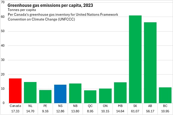 Nova Scotia's greenhouse gas emissions amounted to 12.86 tonnes per capita, below the national average of 17.33 tonnes per capita. Saskatchewan and Alberta had the highest per capita greenhouse gas emissions (by multiples of the next highest per capita emitters). Québec and Prince Edward Island had the lowest per capita emissions of greenhouse gases in 2023.