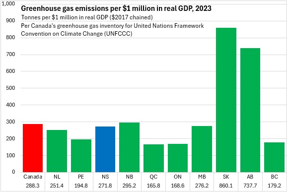 Emissions of greenhouse gases are typically associated with energy production and consumption that are significant parts of economic output. Nova Scotia's greenhouse gas emissions amounted to about 271.8 tonnes per million dollars of real GDP in 2023. This was below the national average emissions intensity of 288.3 tonnes per million dollars of real GDP. Saskatchewan and Alberta had the most emissions-intensive economies among provinces, with over twice the emissions per million dollars of real GDP of the third most emissions-intensive provincial economy (New Brunswick). The economies of Québec and Ontario had the least emissions per million dollars of real GDP.