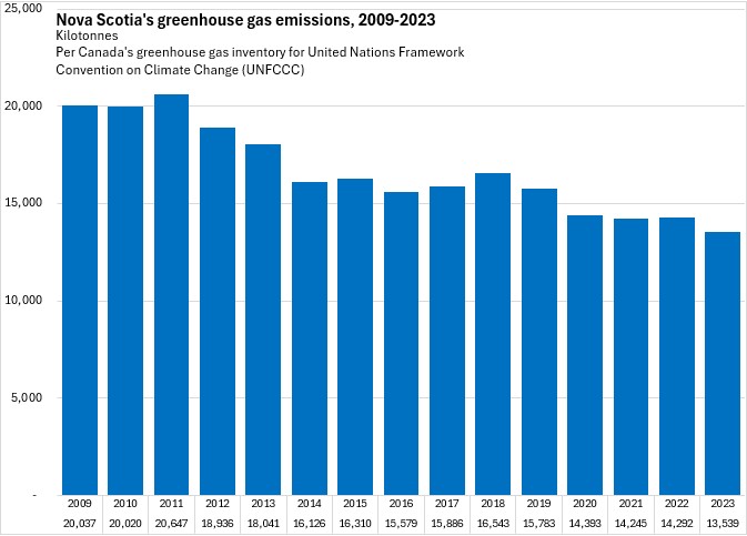 Nova Scotia's greenhouse gas emissions declined by 6,498 kiltoonnes from 2009 to 2023. The sharpest period of declining greenhouse gas emissions in Nova Scotia was from 2011 to 2016.
