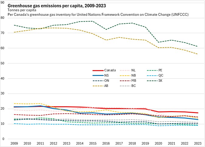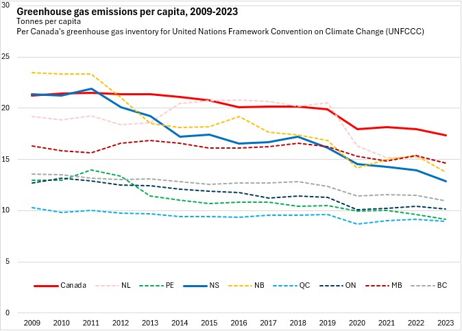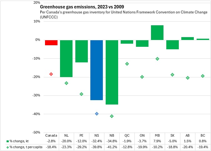 On a per capita basis, Nova Scotia's greenhouse gas emissions have fallen by 39.8% since 2009. Only New Brunswick reported a steeper per capita emissions drop. Nationally, per capita emissions were down 18.4% from 2009 to 2023 with declines across all provinces.