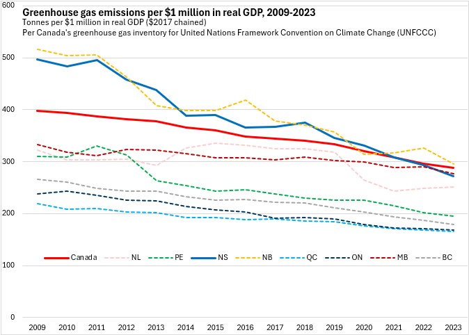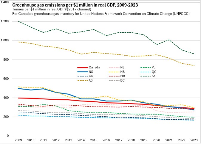 Likewise, Alberta and Saskatchewan consistently report greater emissions intensity in their economies (measured as emissions per million dollars in real GDP).