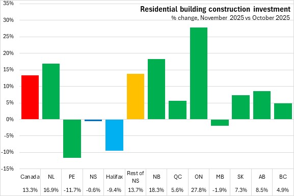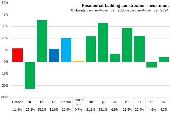 Nova Scotia's November 2025 residential construction investment declined 0.6% to $450.5 million. Halifax residential construction was down 9.4% to $253.7 million. Outside of Halifax residential construction was up 13.7% to $196.8 million. National residential construction increased by 13.3%, with gains in seven provinces. Ontario reported the fastest gain while Prince Edward Island reported the fastest decline.