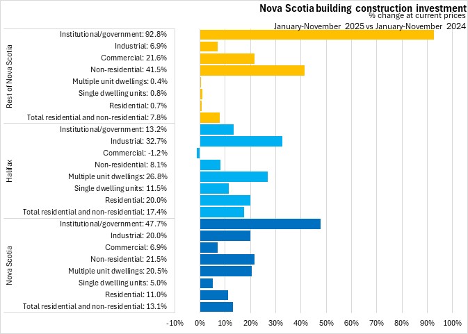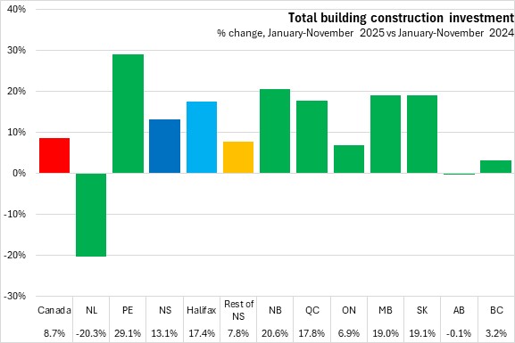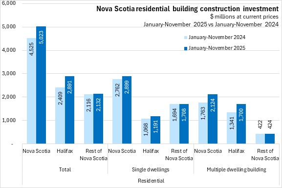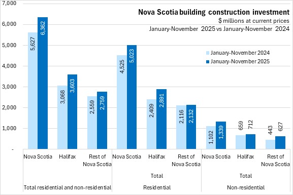 Nova Scotia's total building construction investment increased from $5,627 million in January-November 2024 to $6,362 million in January-November 2025. Residential investment as well as non-residential investment were up across the province.
