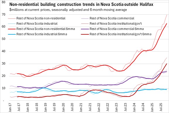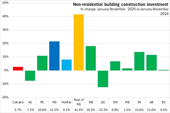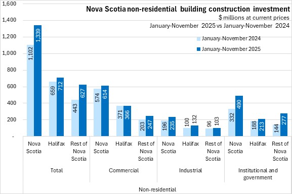 Nova Scotia's non-residential building construction grew 1.9% to $132.7 million. In Halifax, non-residential construction was down 1.3% to $62.9 million. Outside of Halifax, non-residential construction was up 4.9% to $69.8 million. National non-residential building construction grew 1.4% in November 2025 with increases in all provinces. Newfoundland and labrador reported the largest gain while Québec and Ontario reported the slowest.