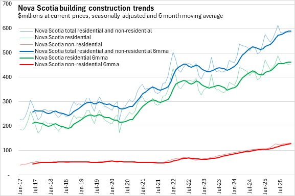 Investment in Nova Scotia building construction edged down 0.04% in November 2025 to $583.2 million. Halifax monthly building construction was down 7.9% to $316.6 million while outside of Halifax building construction was up 11.3% to $266.6 million. Nationally, investment in building construction rose 9.7% with gains in seven provinces. Ontario reported the fastest gain in building construction investment, while Prince Edward Island reported the steepest decline.