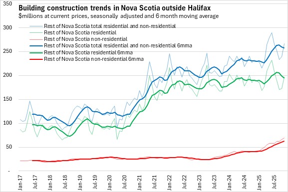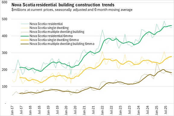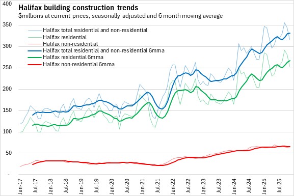 In Halifax, residential construction investment had trended up for multi-unit dwellings since late 2024 and a declining trend in recent months. Single unit dwelling investments have been on a rising trend in in recent months. Outside the city, investment in single dwelling unit construction is typically higher than for multi-unit structures. In Halifax, multiple dwelling unit buildings are a larger share of investment than single dwelling units.