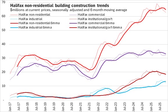 Halifax commercial and institutional/government building construction have plateaued and declined in recent months, while industrial projects continue to grow. Outside the city, non-residential investment levels continue to grow on rising institutional/government and commercial building investments.